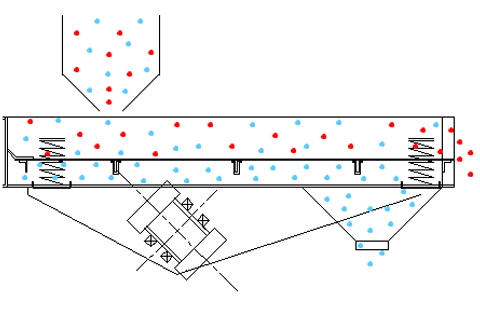 DZSF系列吊掛式直線振動篩為雙振動電機驅動。當兩臺振動電機做同步、反向旋轉時,其偏心塊所產生的激振力在平行于電機軸線的方向相互抵消,在垂直于電機軸的方向疊為一合力,因此篩機的運動軌跡為一直線。兩電機軸相對篩面在垂直方向有一傾角,在激振力和物料自重力的合力作用下,物料在篩面上被拋起跳躍或向前作直線運動,從而達到對物料進行篩選和分級的目的。