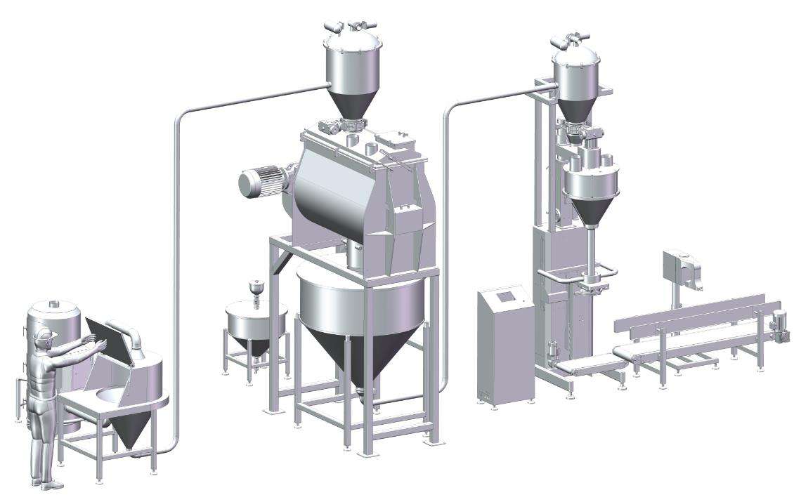 當(dāng)小袋物料需要拆包倒入下道工序時(shí),只需人工直接拆包放入系統(tǒng)即可。給料過(guò)程中產(chǎn)生的物料粉塵由除塵風(fēng)機(jī)收集。物料通過(guò)振動(dòng)篩(安全篩)攔截散狀物料和異物,保證符合要求的顆粒順利輸入。
