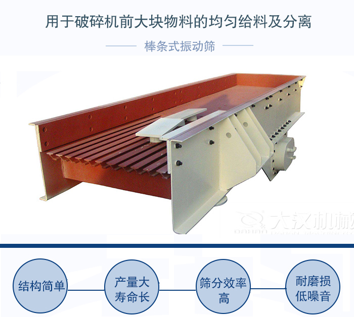 BTS棒條式振動篩用于破碎機前大塊物料的均勻給料及分離,棒條式振動篩特別適用于水電行業(yè)、建筑石料及黑色或有色金屬、礦石粗破前給料和初篩;棒條式振動篩振動給料機采用振動電機為激振源,結(jié)構(gòu)簡單、維護方便;產(chǎn)量大,壽命長,結(jié)實耐用。