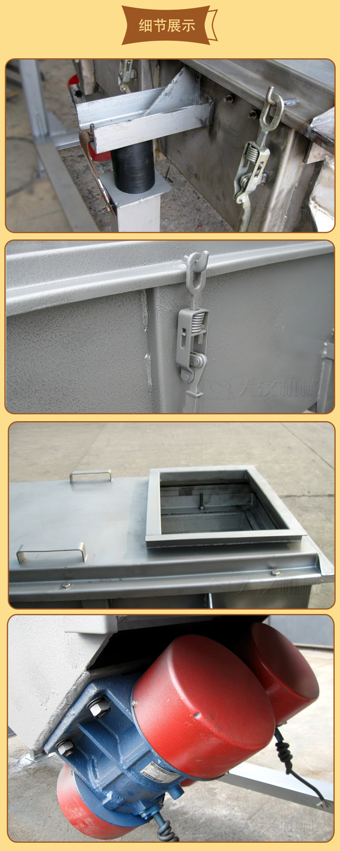 5、電機臺座:安裝振動電機,使用前連接螺釘必須擰緊,特別是新篩機試用前三天、必須反復(fù)緊固,以免松動造成事故。