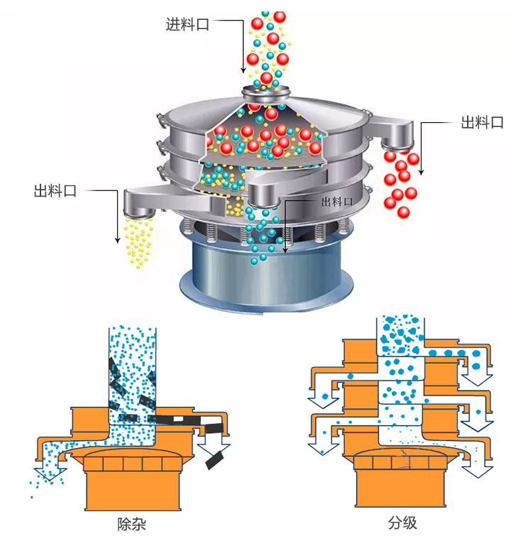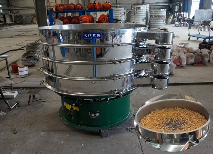 將速凍玉米倒入篩機中,在振動電機的作用下,速凍玉米在篩面上由中間向四周擴散,期間,速凍玉米根據(jù)粒度通過篩網(wǎng),大于篩網(wǎng)尺寸的速凍玉米將停留在篩面上并從出料口排出,小于篩孔的速凍玉米將進入下層篩網(wǎng)繼續(xù)篩分,直至被排出。